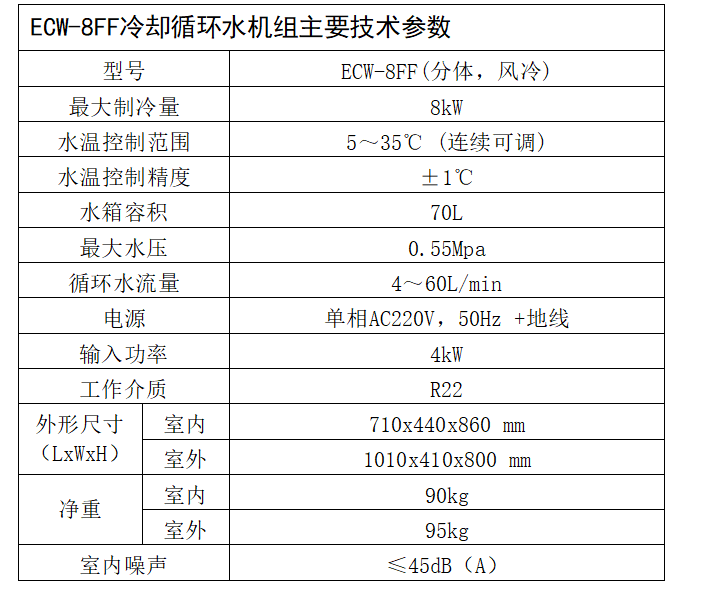 ECW-8FF冷却循环水机组--水冷机是为仪器设备提供恒温冷却水的产品。其工作原理是将仪器设备产生的热量,通过介质--水,置换到水冷机的水箱中;水箱中的热量再通过介质--制冷剂,置换到水冷机的室外机冷凝器;室外机冷凝器中的热量再通过风扇排到室外(风冷式水冷机)。